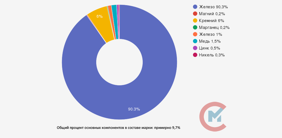 АК7 представляет собой металлический сплав на основе алюминия, содержание которого в АК7 может варьироваться от 87,6% до 93,6%. Кремний, марганец и магний неизбежно присутствуют в сплавах АК7. Допустимое количество примесей определяется таблицей химического состава.