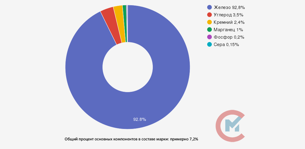Железо – основной элемент чугуна, следующим по содержанию в составе является углерод, именно он снижает пластичность сплава, но повышает его литейные качества и дает малую усадку при застывании. Также, пластинчатый графит в составе придает сплаву повышенную износостойкость, прочность на сжатие. Дополнительно чугун содержит в себе кремний, серу, марганец и фосфор.